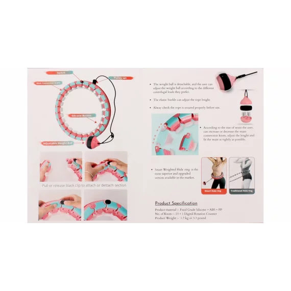 Este fabricat din plastic ABS solid si functioneaza pe principiul pe baza unor greutati, pe care le puteti deplasa in jurul corpului printr-o miscare circulara. Cercul este format din 24 de noduri detasabile cu ajutorul carora setarea circumferintei necesare a taliei este o chestiune de cateva secunde. Circumferinta maxima a taliei poate fi setata pana la 110 cm. Lungimea snurului de greutate este, de asemenea, reglabila si astfel pana la 22 - 40 cm. Daca este necesar, este posibila dezasamblarea greutatii prin slabirea surubului din partea de jos si indepartarea incarcaturii pentru a reduce greutatea totala a acesteia.