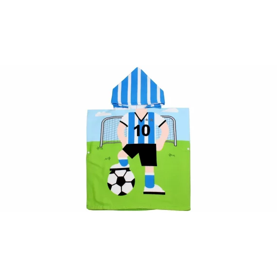 Prosop Merco Fotbal pentru copii este un accesoriu ideal pentru plaja sau piscina. Este fabricat din 100% poliester, absoarbe bine si copilul dvs. va fi uscat in cel mai scurt timp. Poncho-ul este usor si compact, ocupand un spatiu minim in geanta sau valiza. Taietura lejera permite schimbarea usoara.